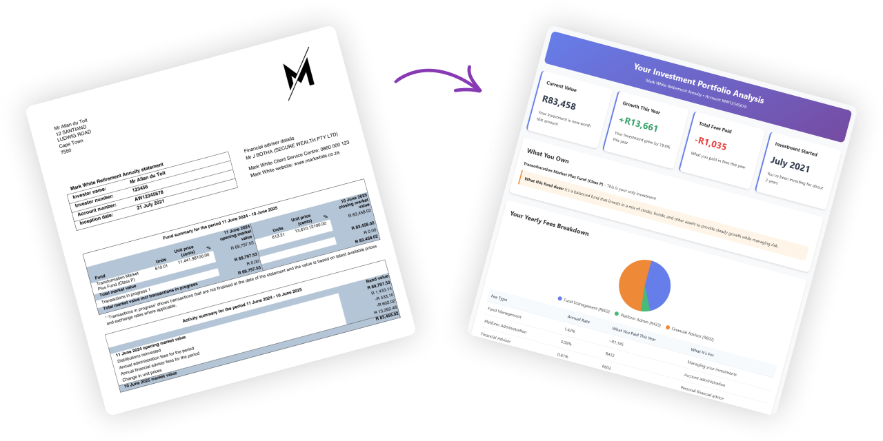 It will translate your statement to plain English, so you can get a clear breakdown of performance, fees, long-term costs, and how it compares to the market.